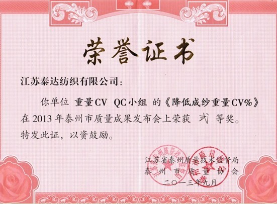 同時(shí),公司QC小組攜此課題參加了2013年“泰州移動(dòng)杯”QC小組質(zhì)量成果大賽并最終入選。2013年9月26日,泰州市質(zhì)量技術(shù)監(jiān)督局特邀有關(guān)領(lǐng)導(dǎo)和專(zhuān)家擔(dān)任評(píng)委,對(duì)各企業(yè)入選成果進(jìn)行評(píng)審。最終,我公司“降低成紗重量CV%”QC小組榮獲二等獎(jiǎng),這是姜堰區(qū)入選企業(yè)榮獲的最高名次,亦是泰州全市、區(qū)范圍內(nèi)紡織企業(yè)獲獎(jiǎng)的最高名次。